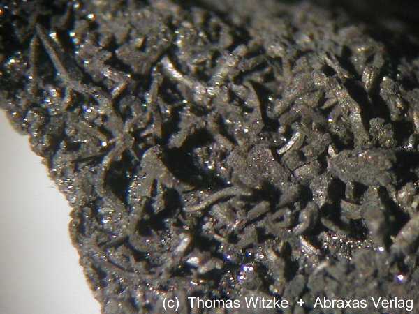 Πρισματικοί και κεκαμένοι κρύσταλλοι αρσενικού. Shaft 371, Erzgebirge, Saxony, Γερμανία. Photo: Dr. Thomas Witzke, Rostock. |