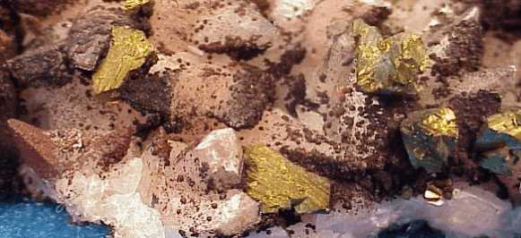 Χαλκοπυρίτης με αιματίτη (καστανό) και ασβεστίτη (λευκό). Ορυχείο Pea Ridge Iron, Washington County, Missouri, Η.Π.Α. Photo: Hershel Friedman, The Mineral and Gemstone Kingdom. |