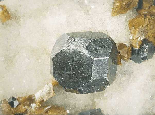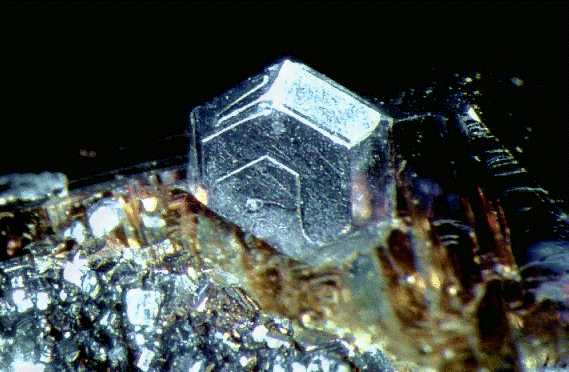 Κυβικός κρύσταλλος γαληνίτη πάνω σε σιδηρίτη και χαλαζία (1 cm). Neudorf, Harz, Γερμανία. Photo: Olaf Medenbach, The Magic of Minerals. |