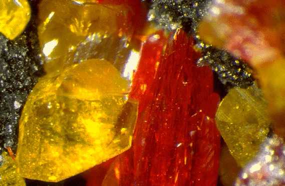 Κίτρινη σανδαράχη με κόκκινη σανδαράχη. Ορυχείο Getchell, Golconda, Humboldt County, Nevada, Η.Π.Α. Photo: Lou Perloff, The Photo-Atlas of Minerals. |
