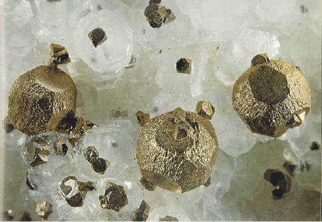 Κρύσταλλοι σιδηροπυρίτη πάνω σε ασβεστίτη (2,5 cm). Trepca, Γιουγκοσλαβία. Photo: Olaf Medenbach, The Magic of Minerals. |