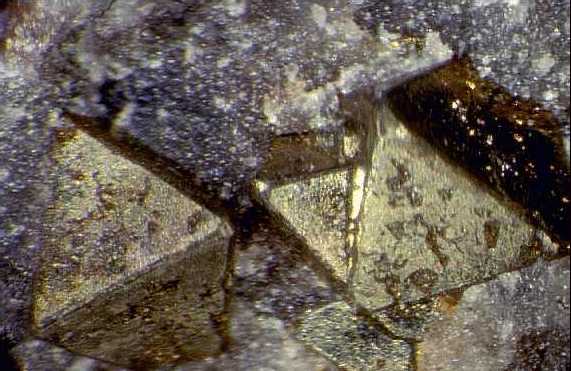 Προσανατολισμένη ανάπτυξη σιδηροπυρίτη πάνω σε ασβεστίτη (2 cm). Ορυχείο Lindenberg, Muenster, Taunus, Γερμανία. Photo: Olaf Medenbach, The Magic of Minerals. |