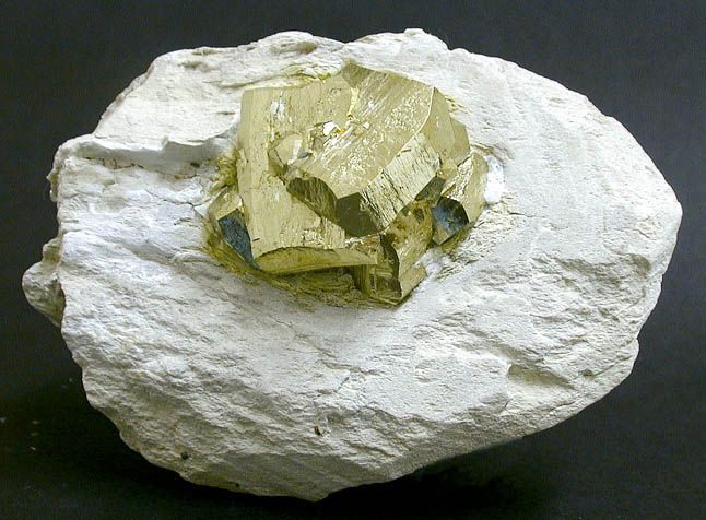 Σιδηροπυρίτης με ασβεστίτη (7,5 cm). Ορυχείο Panasqueira, Beira Baixa, Πορτογαλία. Photo: Francesc Fabre, Fabre Minerals. |