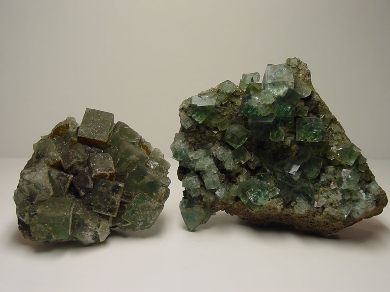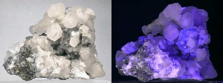 Φθορίτης κάτω από λευκό φως (αριστερά) και υπεριώδες φως (δεξιά) (φθορισμός) (6 cm). Heights Quarry, Weardale, County Durham, Μεγάλη Βρετανία. Photo: Amethyst Galleries, Inc. |