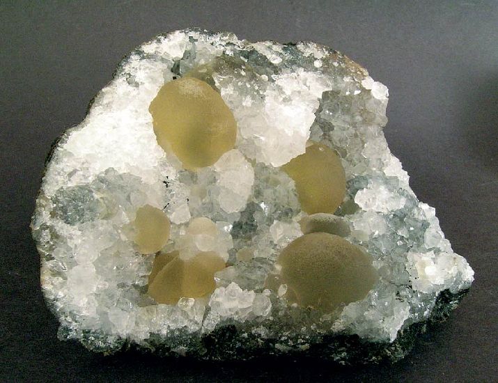 Σφαιρόμορφα συσσωματώματα φθορίτη μέσα σε χαλαζία. Mahodri, Nasik, Ινδία. Photo: Francesc Fabre, Fabre Minerals. |