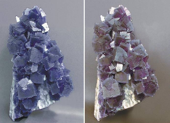 Φθορίτης κάτω από φως ημέρας (αριστερά) και λάμπας βολφραμίου (δεξιά). La Collada, Asturias, Ισπανία. Photo: Francesc Fabre, Fabre Minerals. |