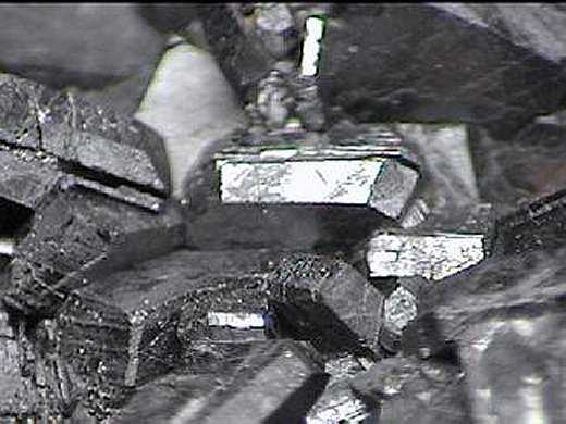 Κρύσταλλοι μπραουνίτη (1,3 cm). Ορυχείο Black Rock, Kalahari Manganese Field, Northern Cape Province, Νότια Αφρική. Photo: John Veevaert, Trinity Mineral Company. |