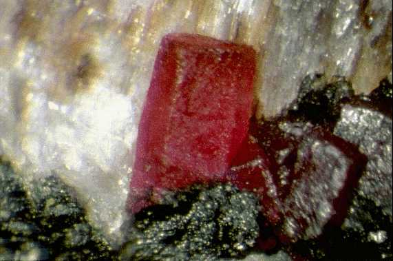 Ρουμπίνι πάνω σε χρωμίτη (μαύρο). Bayleaf, Wake County, North Carolina, Η.Π.Α. Photo: Lou Perloff, The Photo-Atlas of Minerals. |