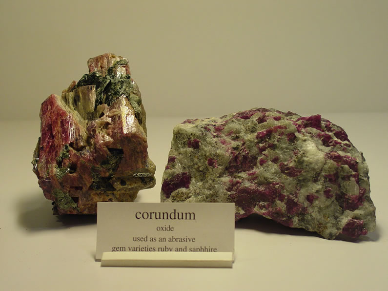 Ρουμπίνι: η κόκκινη ποικιλία του κορουνδίου. Το χρώμα οφείλεται σε ίχνη Cr. Ζαφείρι: το κορούνδιο με όλες τις άλλες αποχρώσεις πλην του κόκκινου, αν και συνήθως σε αυτό αποδίδεται το κυανό χρώμα που οφείλεται σε ίχνη Fe ή Ti. |
