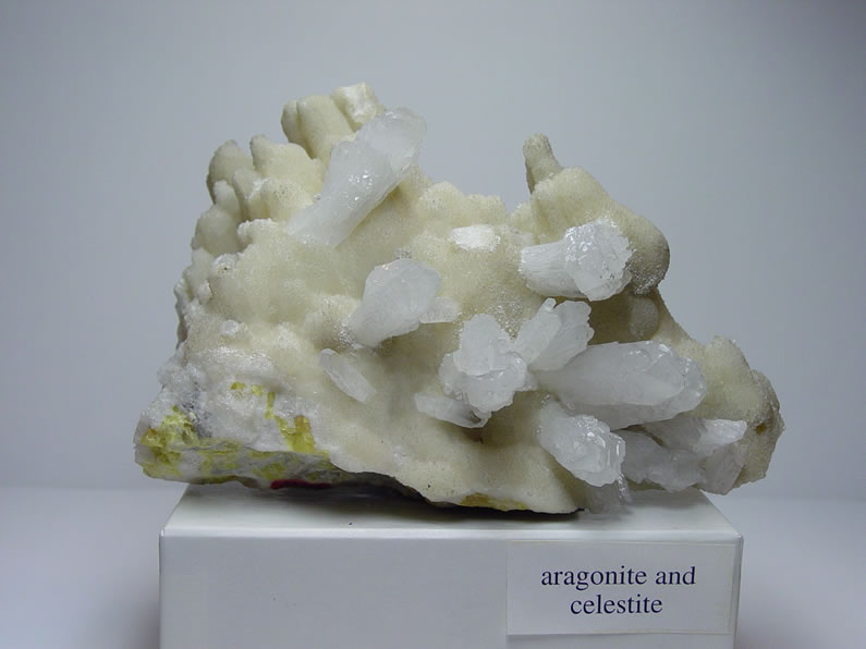 Αραγωνίτης πάνω σε σελεστίνη. Photo: Greene Gallery Mineral Collection, University of Wisconsin, Milwaukee. |