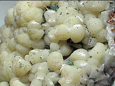 Βοτρυοειδή συσσωματώματα σμιθσωνίτη με κόκκους μαλαχίτη (13 cm). Tsumeb, Ναμίμπια. Photo: John Veevaert, Trinity Mineral Company. |