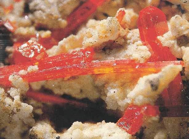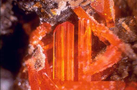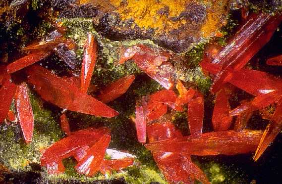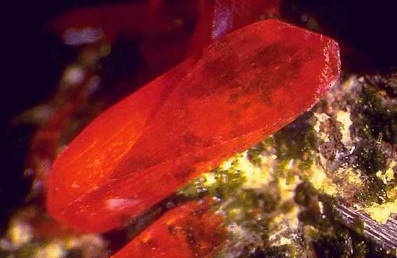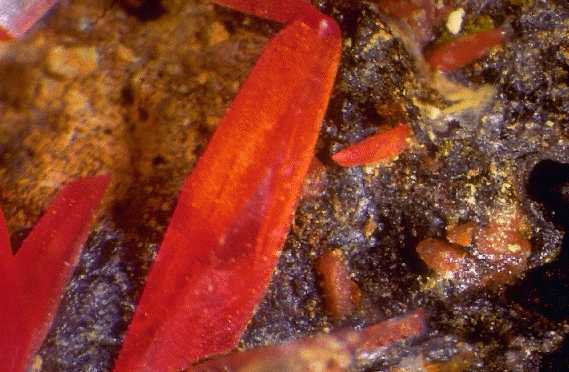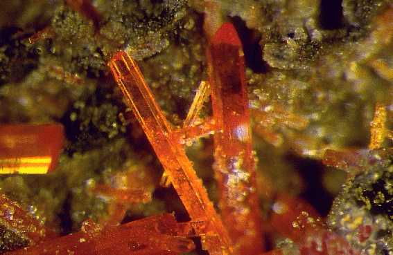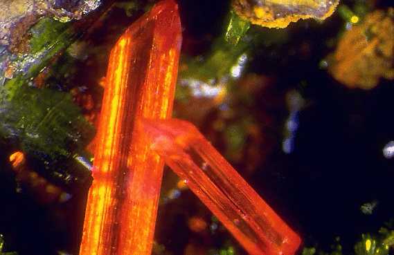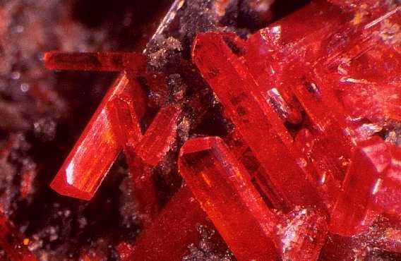 Μακροπρισματικοί κρύσταλλοι κροκοΐτη (1,5 cm). Dundas, Ταζμανία, Αυστραλία. Photo: Olaf Medenbach, The Magic of Minerals. |