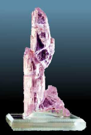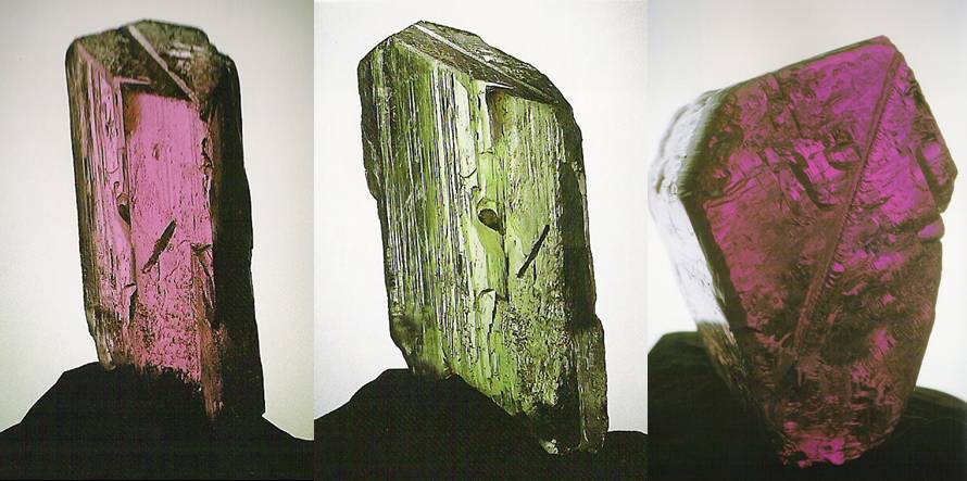 Τρεις όψεις του ιδίου κρυστάλλου κουνζίτη που εμφανίζει έντονο πλεοχροϊσμό. Minas Gerais, Βραζιλία. Photo: The National Gem Collection. |