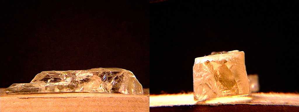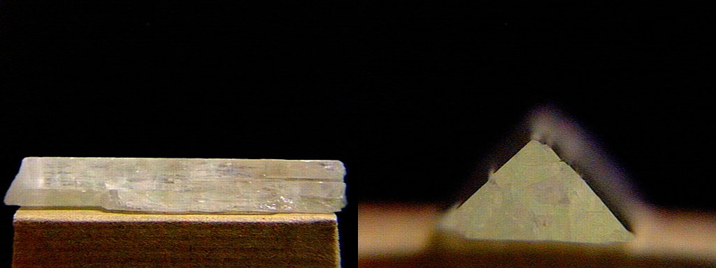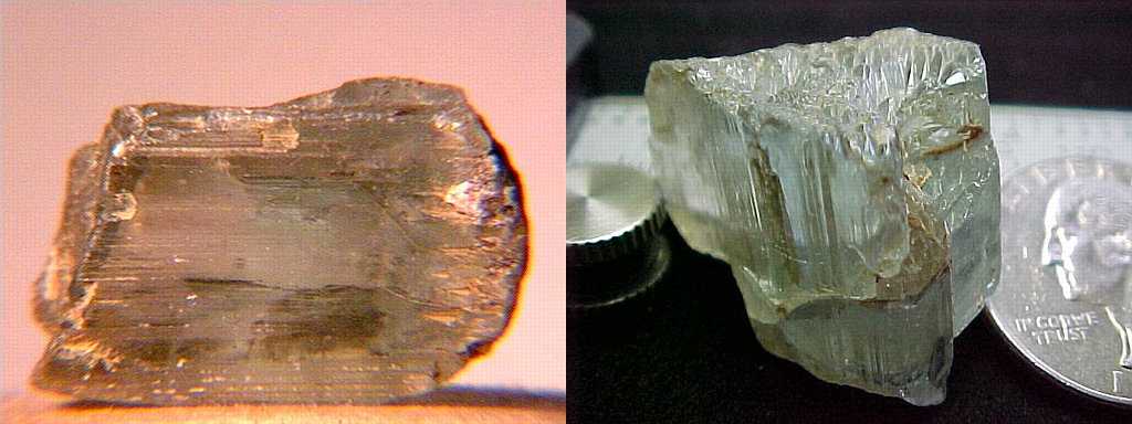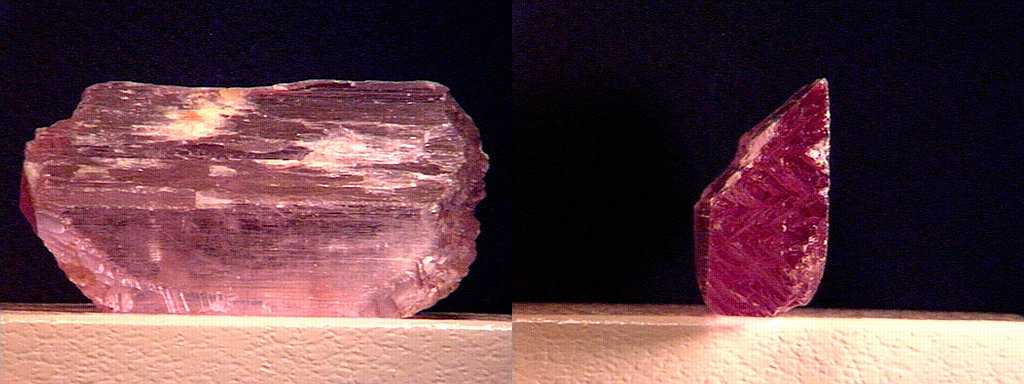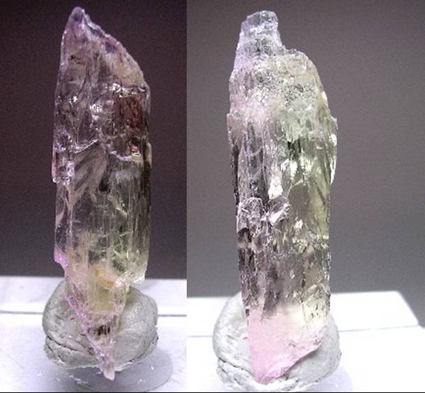 Δύο όψεις του ιδίου κρυστάλλου κουνζίτη που εμφανίζει έντονο πλεοχροϊσμό. Minas Gerais, Βραζιλία. Photo: The National Gem Collection. |