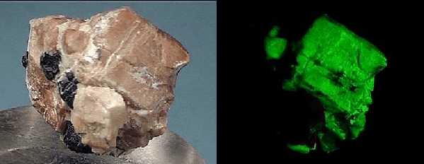 Κρύσταλλοι βιλλεμίτη κάτω από το υπεριώδες φώς (3 cm). Franklin, New Jersey, Η.Π.Α. Photo: John Veevaert, Trinity Mineral Company. |