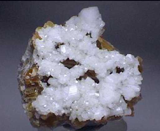 Κρύσταλλοι αρμοτόμου (λευκό) πάνω σε ασβεστίτη (καστανό). Strontian Hills, Strontian, Argyll, Σκωτία. Photo: John Veevaert, Trinity Mineral Company. |
