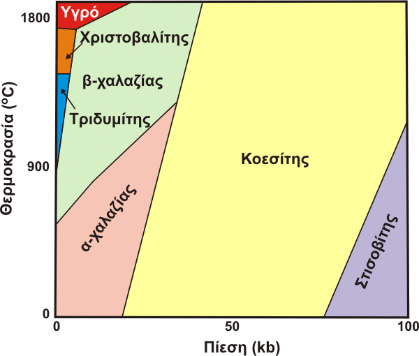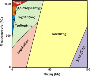 | Σχήμα 2. Διάγραμμα φάσεως (Ρ-Τ) των πολύμορφων ορυκτών του SiO2. |