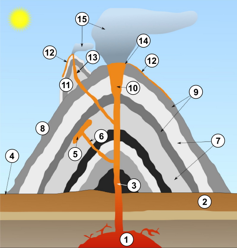 | 1. Μαγματικός θάλαμος | 6. Φλέβα τροφοδοσίας | 11. Παρασιτικός κώνος | |||||||||||||||||||