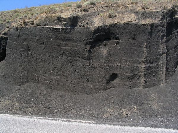 Τομή του κώνου όπου διακρίνονται οι στρώσεις της τέφρας και ανάμεσα κάποιες ηφαιστειακές βολίδες. Photo: Σολδάτος Τ. |