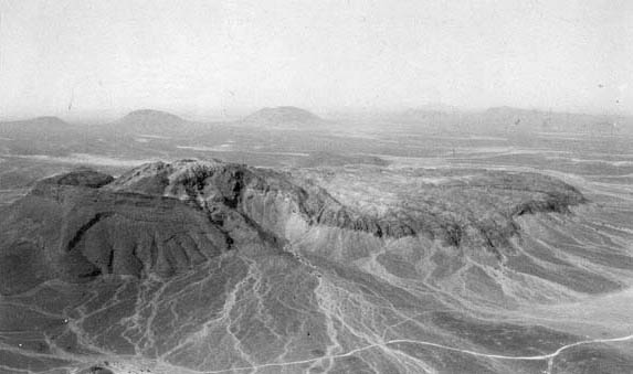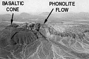 Φωνολιθική ροή λάβας (Harrat Kishb, Σαουδική Αραβία). Η λάβα εκχύνεται από ένα βασαλτικό κώνο σκωριών. Η ροή έχει μήκος 2.5 km, πλάτος 1.5 km και πάχος 110 m. Photo: Roobol J. |