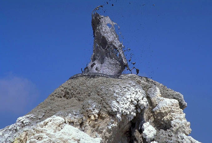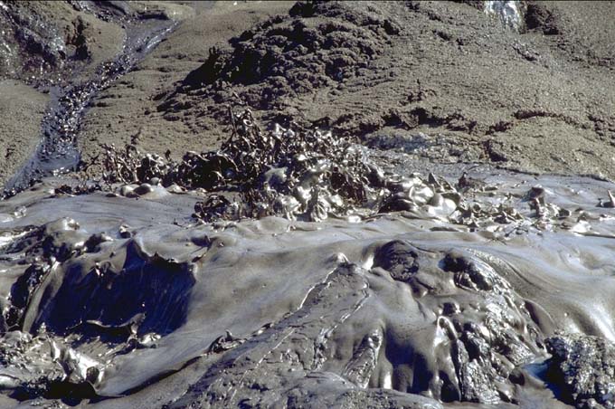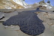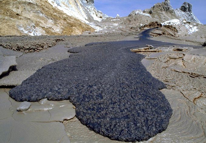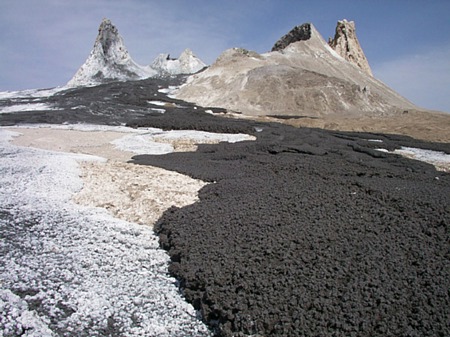 Ροές καρμπονατιτικής λάβας (Ol Doinyo Lengai, Τανζανία). Ή λάβα έχει χαμηλή θερμοκρασία και μικρό ιξώδες γι΄αυτό και ροές έχουν πάχος μερικών εκατοστών. Η λάβα, αν και πυρακτωμένη, μοιάζει με μαύρη λάσπη. Μόλις όμως έρθει σε επαφή με το ατμοσφαιρικό νερό ενυδατώνεται και γίνεται λευκή. Photo: CRPG, Davies G., McGill. |