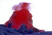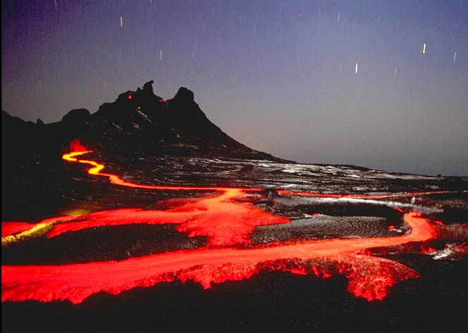 Οι ροές καρμπονατιτικής λάβας, μολονότι είναι πυρακτωμένες, κατά την ημέρα μοιάζουν με ροές μαύρης λάσπης, όταν όμως παρατηρούνται τη νύχτα εμφανίζουν λαμπερό κόκκινο χρώμα. Photo: Fulle M. |